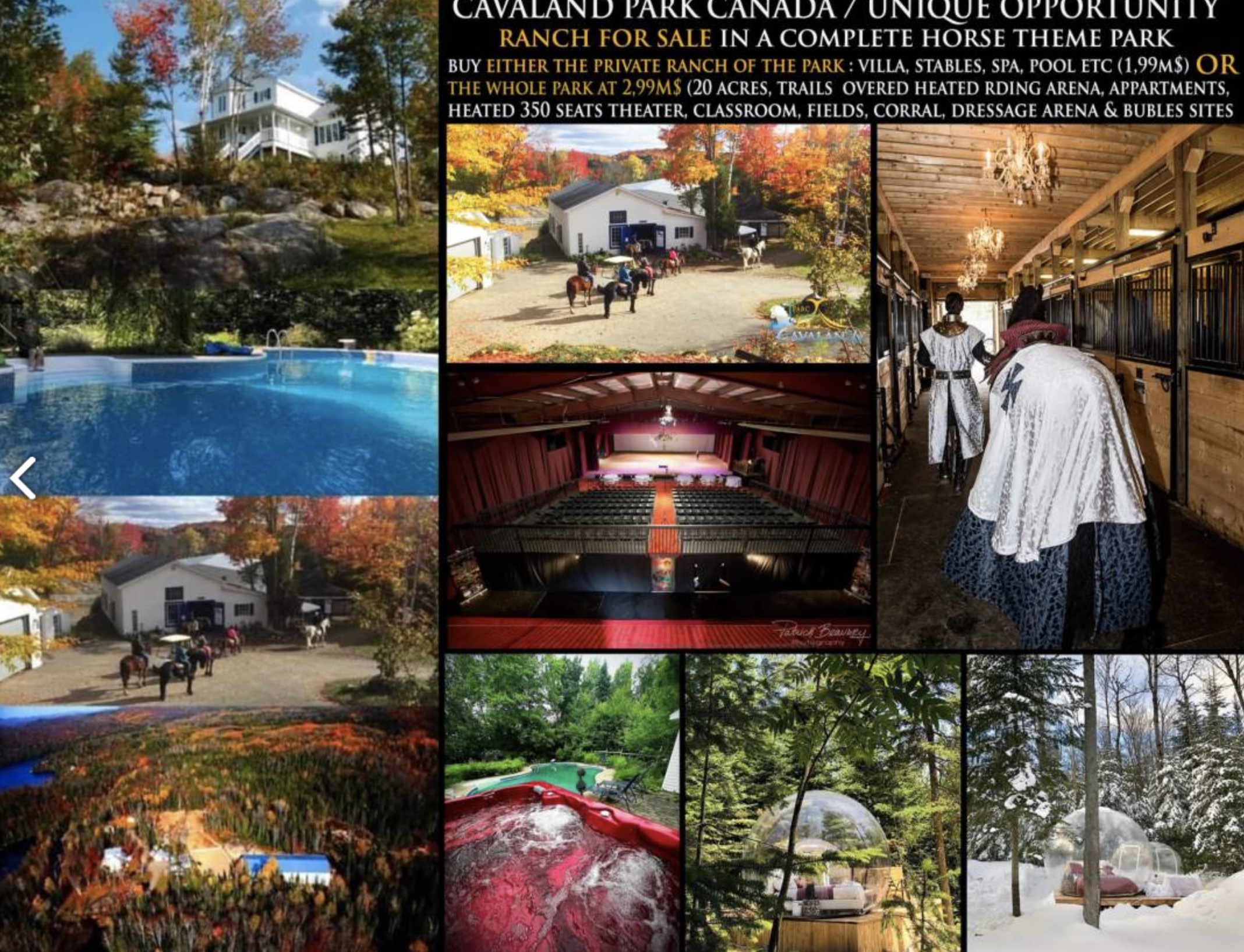 Buy the equestrian center in totality with the covered heated riding arena (2,17M $, 20 acres, with villa, 11m x 6m Tahiti heated pool, 12 seats spa, heated theater / covered riding arena, 2 stables of 24 heated boxes, 2 garages, trails, paddocks, horse swimming pool, dormitory, 24/7 monitored electric gate, heated bubles/horse observatories, mecanical horse carousel for kids (merry-go-round with 10 wood horses) and much more.