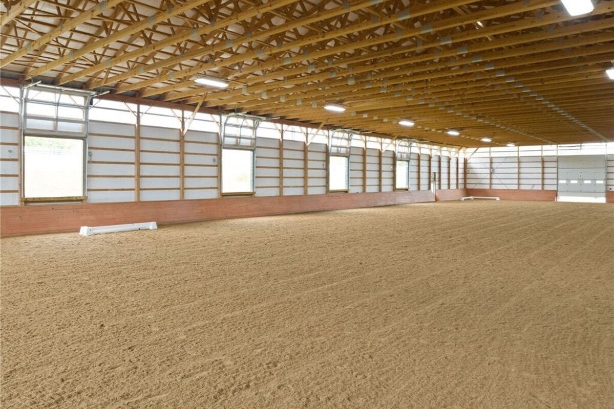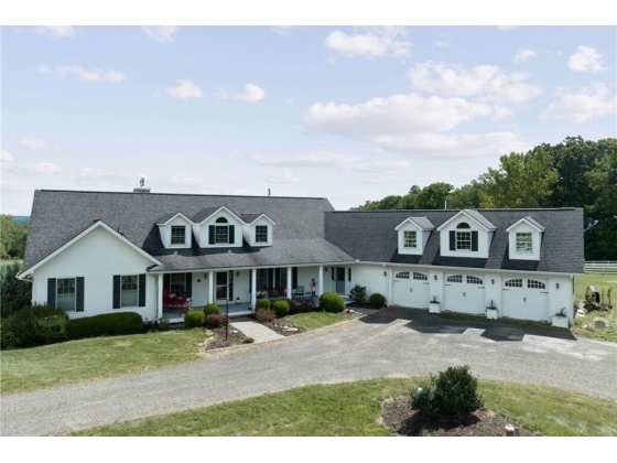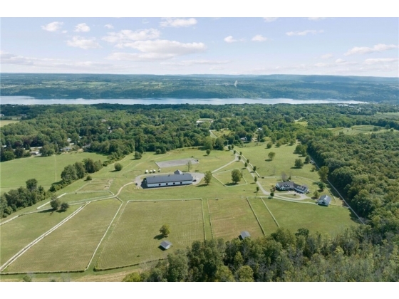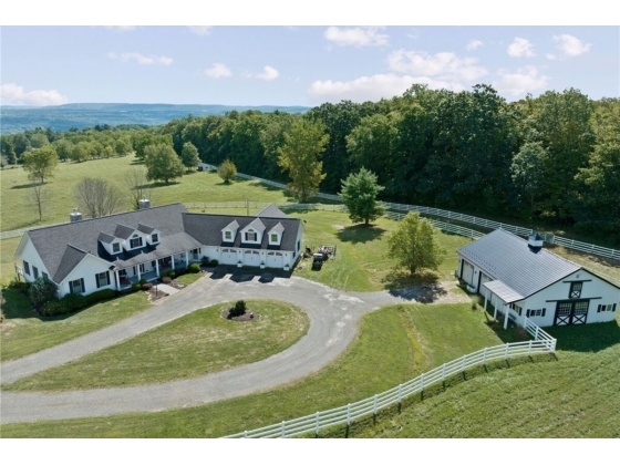 Hidden from view, yet just minutes from Cornell University, this gated equestrian estate offers a setting and opportunity unlike any other. Nestled on 72 terraced acres, a tree-lined lane bordered by white fencing leads to a premier horse facility that combines lifestyle, business, and beauty. Currently home to a thriving boarding operation, this elite center offers endless possibilities for the discerning equestrian. Whether boarding, training, lessons, showing, rehab, rescue, or personal enjoyment, any discipline will thrive here. The centerpiece is a 14 + stall barn with automatic waterers, fans, wash and grooming stalls, plus a heated office, meeting space, and client bathroom. Enjoy year-round riding in the attached 80x205 indoor arena and summer shows in the 100x230 outdoor arena with judge’s gazebo. Eight flex-fenced pastures, four smaller paddocks, and an additional 2-stall barn with storage offer ideal accommodations for horses. The custom 4-bedroom, 3-bath Cape-style home is designed for both comfort and elegance. A great room with living, dining, and cook’s kitchen opens to a wall of Pella windows and glass doors leading to a deck that overlooks the property. A sunroom captures peaceful views of the pastures, while the lower level and spacious attic provide expansion opportunities. The attached 3-car garage with workshop adds convenience and function. The terraced terrain is perfect for conditioning, with space for cross-country jumps and a two-mile perimeter trail. Explore 14 acres of woods and a 10-acre mowed meadow, ideal for riding, walking, or simply soaking in the beauty of the land. This is more than an equestrian property, it’s an unparalleled opportunity to live your passion, run a successful business, and create the equestrian lifestyle you’ve always envisioned, all in a premier location near Ithaca, Cayuga Lake, and the best of the Finger Lakes.
