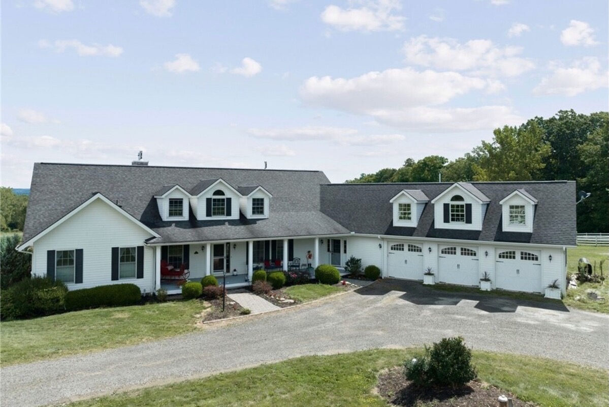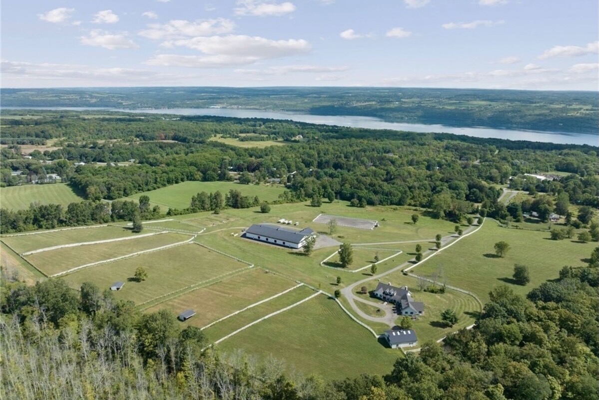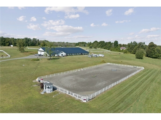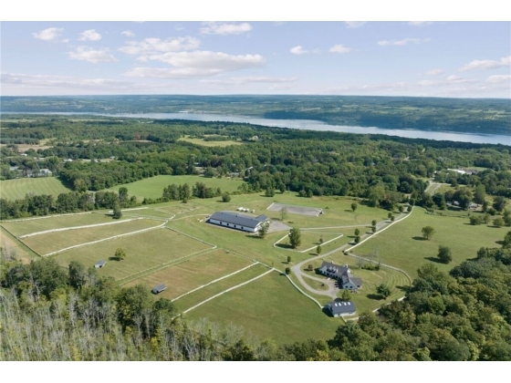 Hidden from view, yet just minutes from Cornell University, this gated equestrian estate offers a setting and opportunity unlike any other. Nestled on 72 terraced acres, a tree-lined lane bordered by classic white fencing leads to a premier horse facility that combines lifestyle, business, and beauty in one extraordinary package. Currently home to a thriving boarding operation, this elite center offers endless possibilities for the discerning equestrian. Whether boarding, training, lessons, showing, rehab, rescue, or personal enjoyment, any discipline will thrive here. The centerpiece is a 14-stall barn (room for 4 more) with automatic waterers, fans, wash and grooming stalls, plus a heated office, meeting space, and client bathroom with shower. Year-round riding is a pleasure in the attached 80x205 indoor arena, while summer shows shine in the 100x230 outdoor arena with judge’s gazebo. Eight flex-fenced pastures, four smaller paddocks, and an additional 2-stall barn with storage offer ideal accommodations for horses of every need. The custom 4-bedroom, 3-bath Cape-style home is designed for both comfort and elegance. A light-filled great room with living, dining, and cook’s kitchen opens to a wall of Pella windows and glass doors leading to a deck that overlooks the property. A tiled sunroom captures peaceful views of the pastures, while the lower level and spacious attic provide expansion opportunities. The attached 3-car garage with workshop adds convenience and function. The terraced terrain is perfect for conditioning, with space for cross-country jumps and a two-mile perimeter trail. Explore 14 acres of woods and a 10-acre mowed meadow, ideal for riding, walking, or simply soaking in the beauty of the land. This is more than an equestrian property, it’s an unparalleled opportunity to live your passion, run a successful business, and create the equestrian lifestyle you’ve always envisioned, all in a premier location near Ithaca, Cayuga Lake, and the best of the Finger Lakes. (Square footage per third party floor plans and includes recently finished 4th bedroom and bathroom
